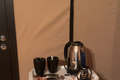 Чайник не достает до розетки, пришлось переставить, можно добавить стандартную посуду: чайные ложки и блюдца. Если протянуть тент над верандой будет вообще классно